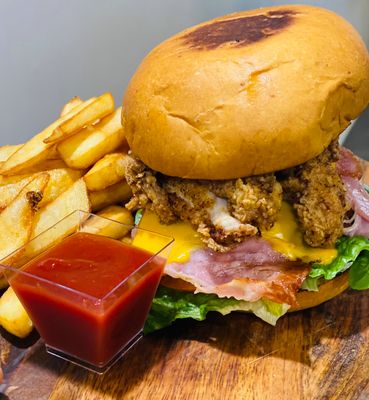 Chicken, bacon, lettuce, tomato, American cheese, burger sauce with fries.